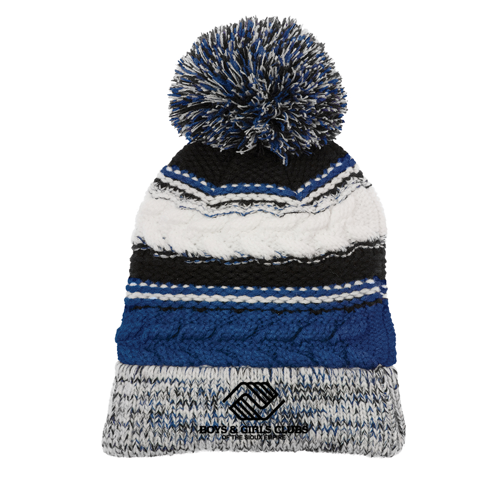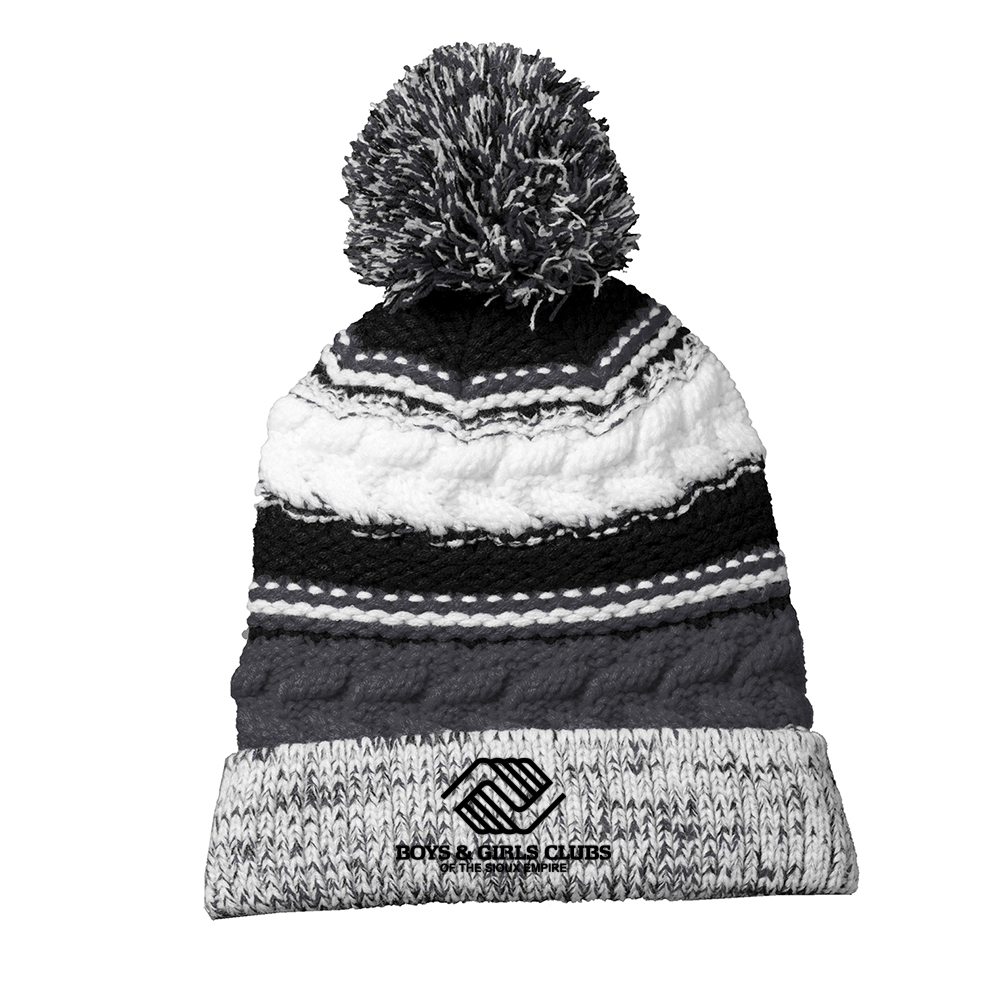 With three team colors and a large pom pom, this chunky-knit beanie will help keep you warm in the stands.